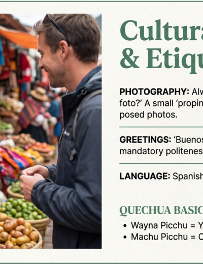 Once you understand the main transportation options and distances between Peru’s key destinations, planning your itinerary becomes much easier. Choosing when to fly, when to take a train, and when to rely on buses or taxis helps you save time, stay comfortable, and make the most of each region. After reviewing this guide, you can continue shaping your trip with our detailed FAQs on Peru’s Etiquette, Typical Food and Drinks, and further Smart Travel Tips, which offer practical advice on staying safe during travel days, managing elevation changes, and navigating popular routes. With the right planning, getting around Peru becomes part of the adventure rather than a challenge.